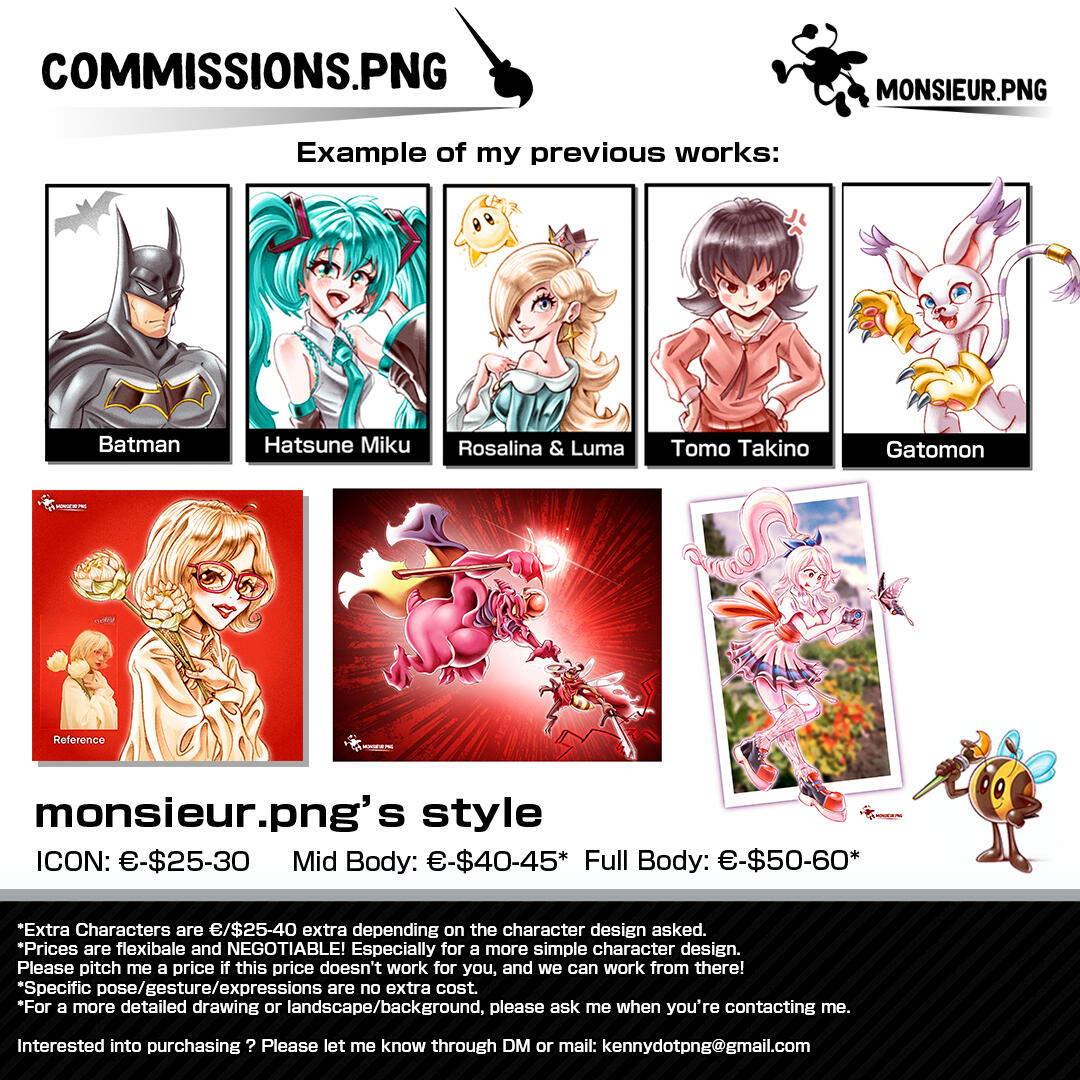 Commission Sheets presenting the different tiers available. Last Update: 10/02/2025Feel free to contact me if you’re interested in purchasing or if you have any questions about it.