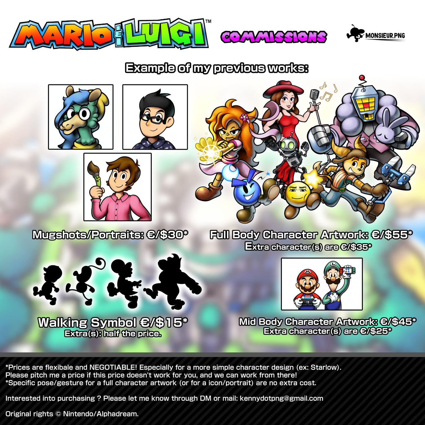 If you'd like to reach out for work inquiries such as commissions or freelancing work, please feel free to message me on social networks where I am or through mail by pressing the button below.